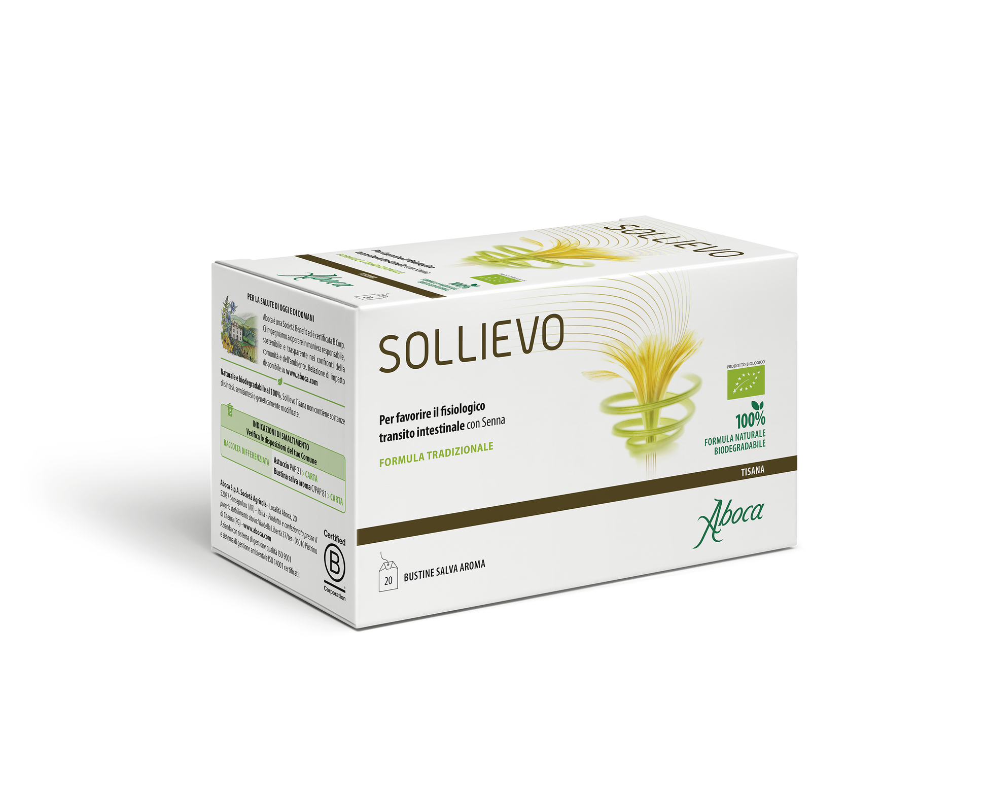 Utile per favorire il fisiologico transito intestinale, agisce rispettando l'intestino grazie alla presenza di fitocomplessi di: Cassia, che svolge un'azione specifica sul transito; Finocchio, Rooibos e Carvi, che favoriscono l'eliminazione dei gas intestinali; Malva, Melissa e Liquirizia, che coadiuvano i fisiologici processi digestivi.Sollievo Bio Tisana, prodotto biologico e 100% naturale, per le caratteristiche della sua azione è indicato per essere utilizzato al bisogno. Inoltre, la presenza di Rooibos e Finocchio, arricchito con il suo olio essenziale, conferisce alla tisana un sapore gradevole anche senza l'aggiunta di zucchero; se necessario si consiglia l'uso del miele.IngredientiCassia (Cassia angustifolia) foglie*; Carvi (Carum carvi) frutti*; Liquirizia (Glycyrrhiza glabra) radice*; Finocchio (Foeniculum vulgare) frutti*; Rooibos (Aspalathus linearis) foglie*; Melissa (Melissa officinalis) foglie*; Malva (Malva sylvestris) foglie*; Finocchio (Foeniculum vulgare) olio essenziale aroma naturale.* Ingrediente BiologicoCaratteristiche nutrizionaliIngredienti funzionali contenuti in una bustina:** Cassia angustifolia foglietitolato in eterosidi idrossiantracenici 2% 1500 mg Carvi frutti 330 mg Liquirizia radice 150 mg Finocchio frutti 132 mg Rooibos foglie 66 mg Melissa foglie 10 mg Malva foglie 44 mg Finocchio olio essenziale 2 mg** I quantitativi indicati si riferiscono agli ingredienti funzionali contenuti in una bustina e non all'infuso.Modalità d'usoSi consiglia di assumere una tazza di tisana alla sera quando se ne ravvisi l'utilità.Un filtro è sufficiente per preparare una tazza di tisana (circa 200 ml). Versare l'acqua portata all'ebollizione in una tazza contenente la bustina filtro avendo cura di tenere coperto il contenitore per non disperdere le sostanze più volatili.Studi analitici condotti dalla ricerca Aboca dimostrano che Sollievo tisana, in 7 minuti di infusione, apporta il quantitativo ottimale di sostanze funzionali.Ogni singola bustina filtro è realizzata con un sistema brevettato di chiusura "annodata" senza collanti e punto metallico. Per mantenere al meglio le caratteristiche organolettiche e le proprieta` delle erbe, ogni filtro è confezionato in bustina "salvaroma". AvvertenzeNon superare le dosi consigliate. Gli integratori non vanno intesi come sostituti di una dieta variata ed equilibrata e devono essere utilizzati nell'ambito di uno stile di vita sano. Il prodotto deve essere tenuto fuori dalla portata dei bambini al di sotto dei tre anni di età. Non utilizzare il prodotto nei bambini, nelle donne in gravidanza e durante l'allattamento, e per periodi di tempo prolungati.FormatoConfezione da 20 bustine da 2,2 gCod. SOBIOTFX- Marca